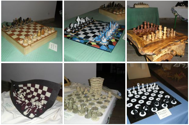 exposição de conjuntos de tabuleiros e peças construídos por artesãos locais